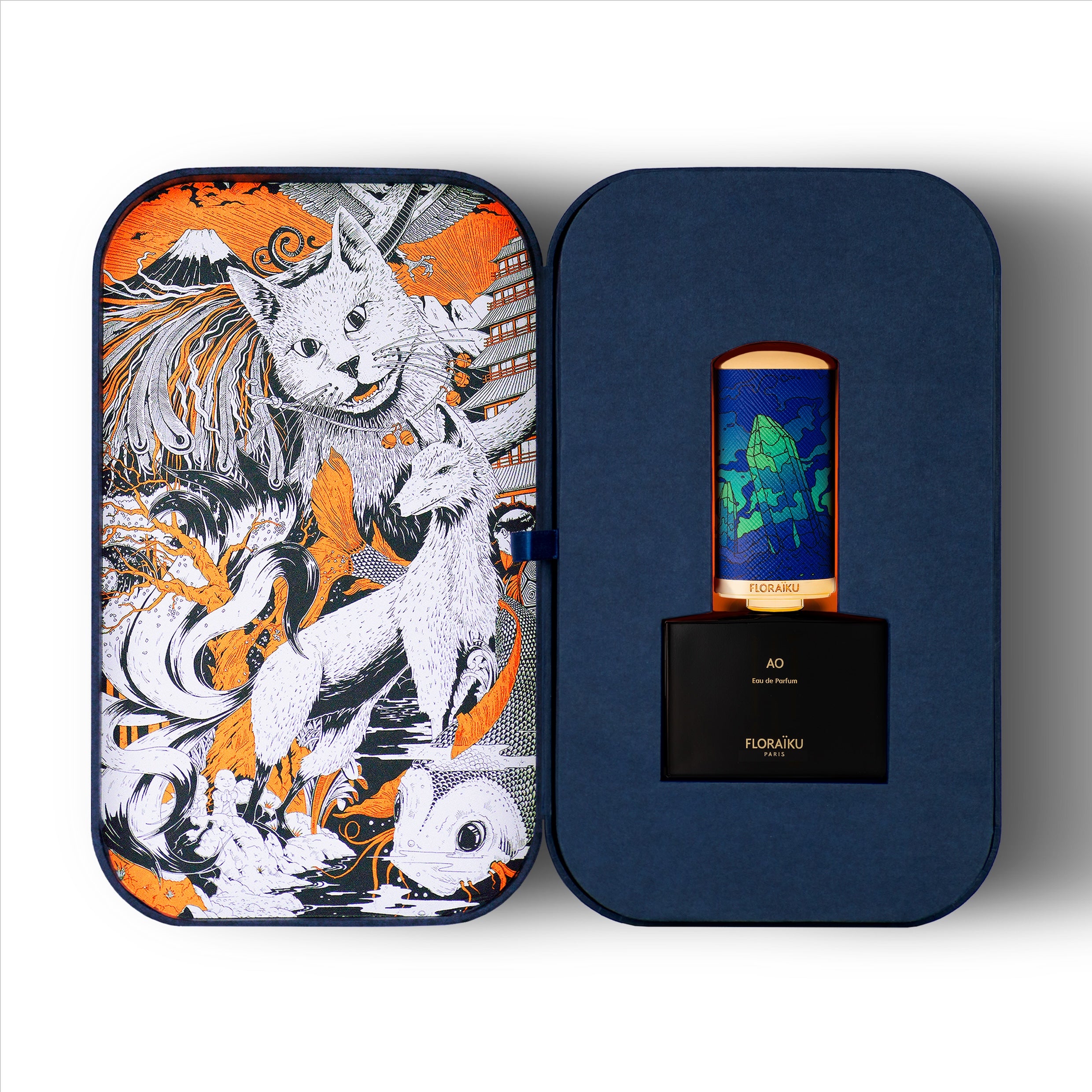 AO signifie au Japon une couleur entre le bleu et le vert, une teinte évolutive. Exactement comme les pierres précieuses peuvent le faire, selon la lumière et la pureté minérale. Ici, elles évoluent facettées comme un parfum, révélant une gamme de nuances subtiles.