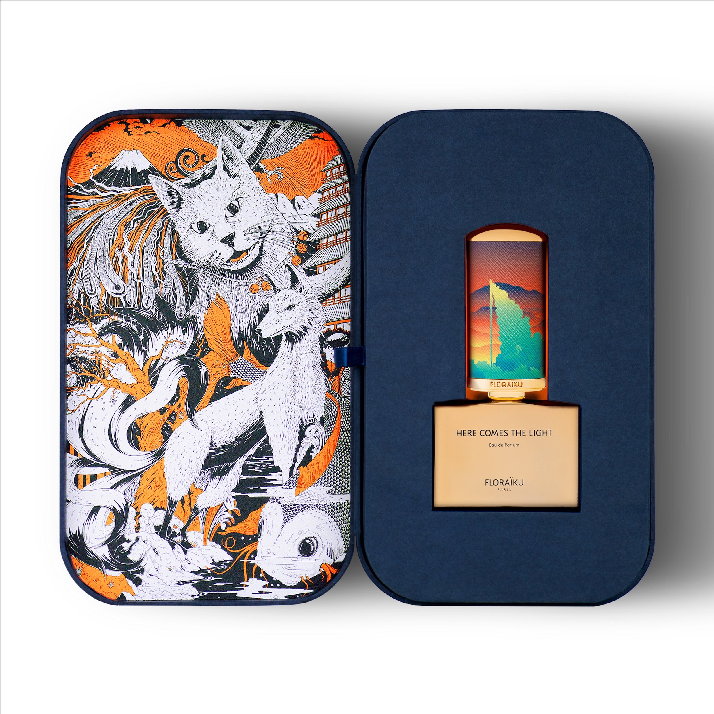 Here Comes the Light s'inspire de l'élément le plus emblématique de la ville : le Jet d'Eau qui brille sur le lac Léman. Le bouchon du flacon en témoigne, avec un design qui combine la verticalité du jet avec l'horizontalité de la ligne de montagne en arrière-plan.