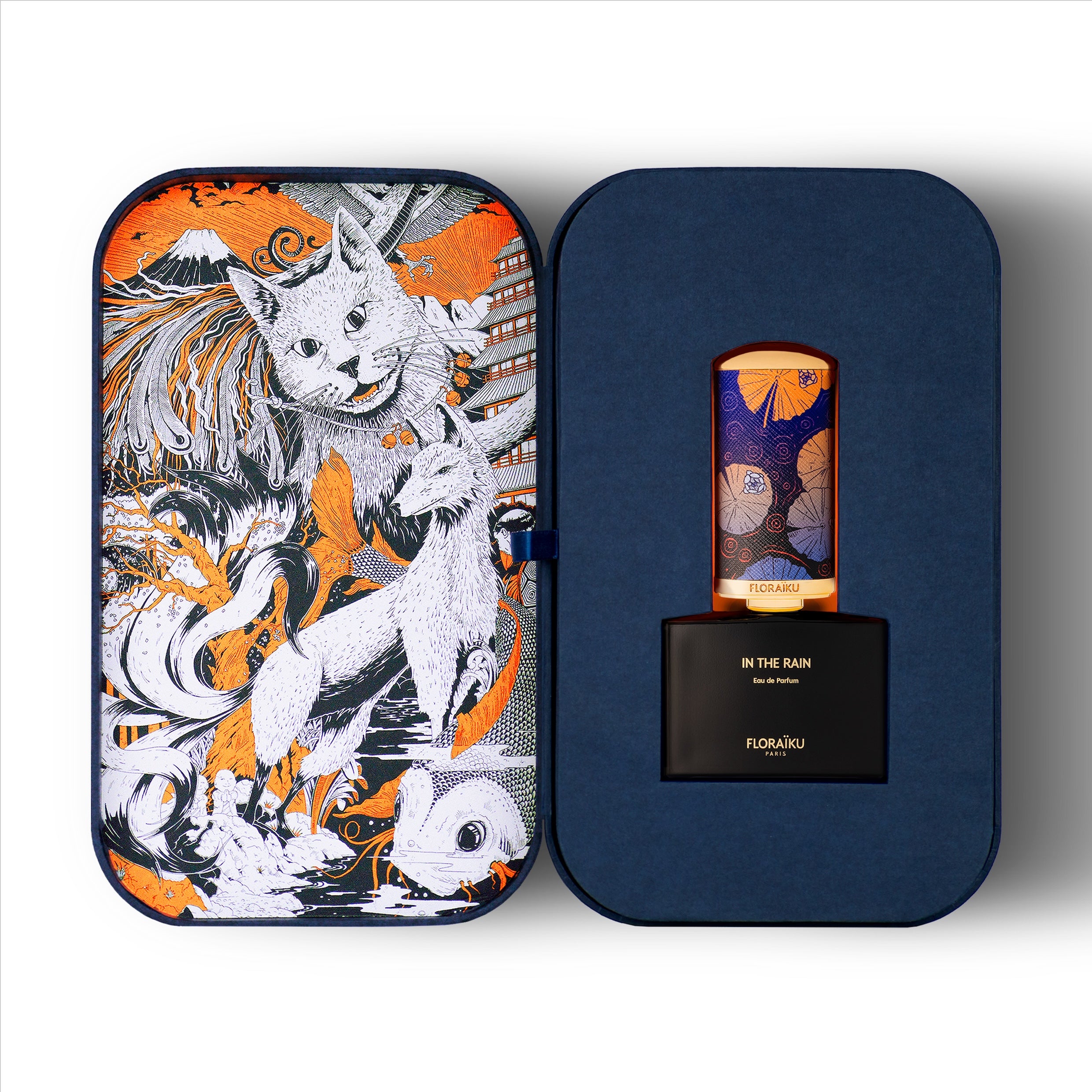 In the Rain, héberge de l'essence de Bergamote, de l'essence de Bois de Cèdre et du Musc boisé, rappelle l'odeur boisée et verte intense qui peut se dégager après une averse et laisser un sillage puissant.