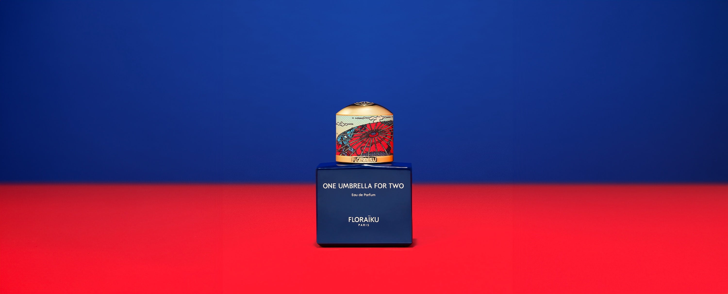 Un parapluie traditionnel japonais nommé wagasa orné d'un motif de dragon, accueille sous son toit un délicat parfum réalisé par la Maison de parfum française, Floraïku Paris, One Umbrella for two.