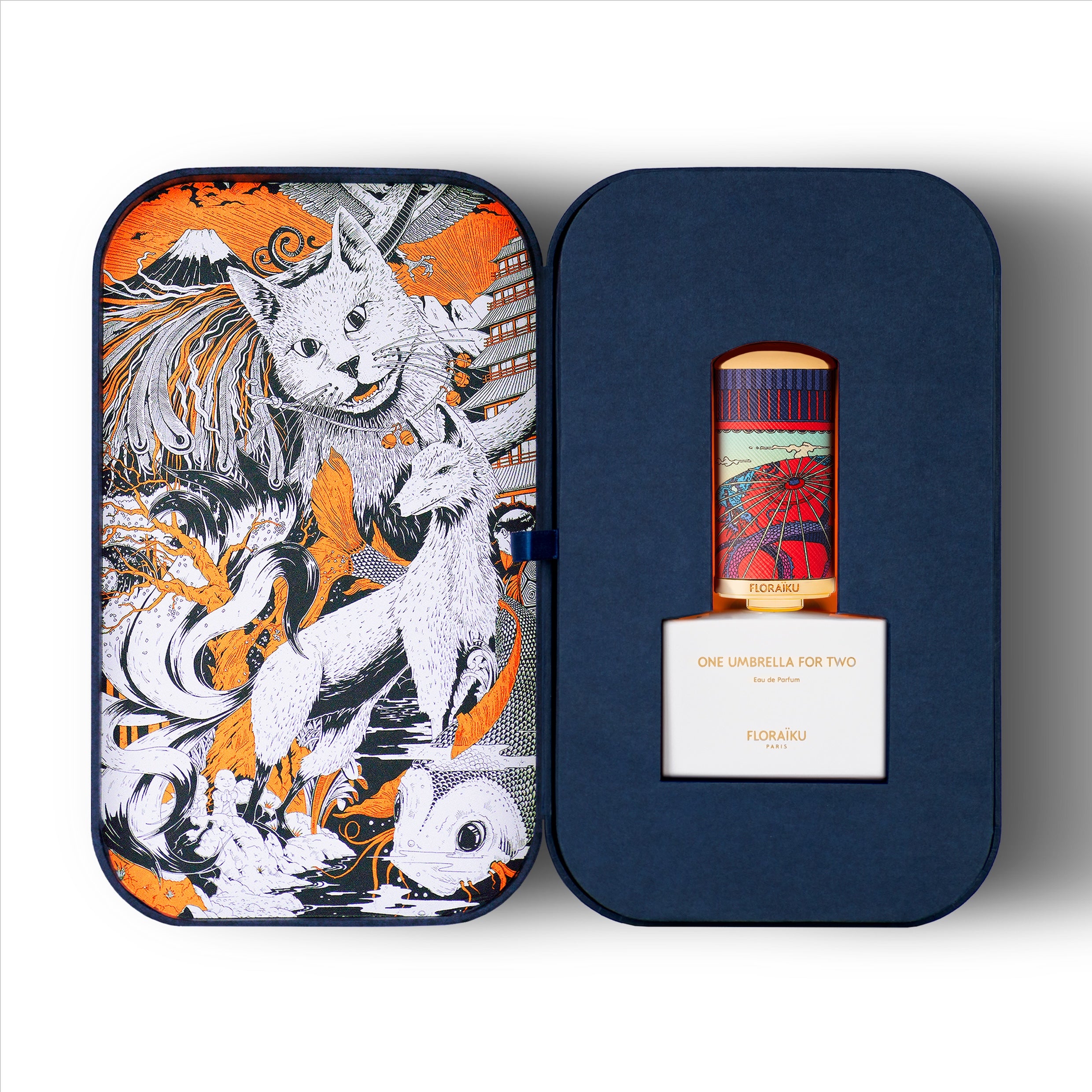 Un parapluie traditionnel japonais nommé wagasa orné d'un motif de dragon, accueille sous son toit un délicat parfum réalisé par la Maison de parfum française, Floraïku Paris, One Umbrella for two.